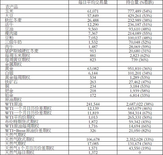 表為2016年11月CME主要商品期權(quán)交易量與持倉量