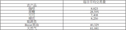 ICE活躍的商品期權(quán)主要有農(nóng)產(chǎn)品——原糖、咖啡、棉花、可可;能源類——原油、天然氣。過去一年ICE平均每日交易量超過2萬手的品種有原糖、Brent原油和天然氣期權(quán)。原糖期權(quán)過去1年平均每日成交量為28,595手,屬于農(nóng)產(chǎn)品中最為活躍的期權(quán)合約。