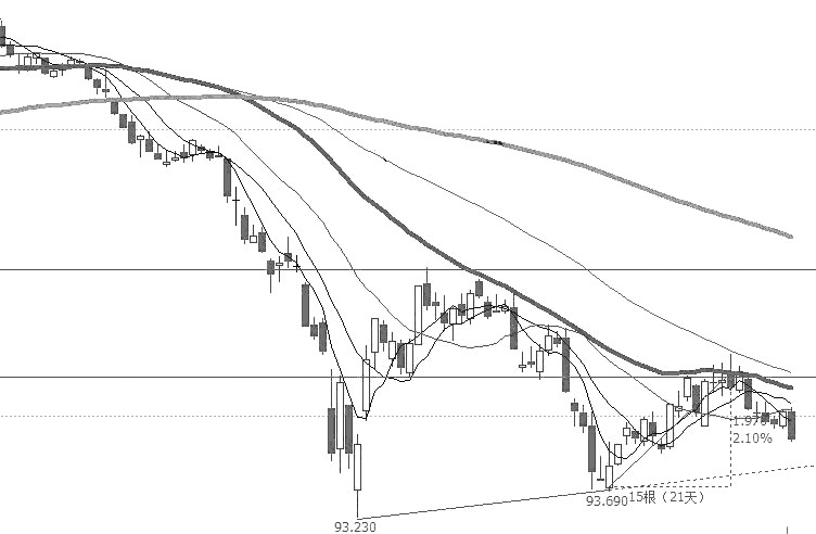 十年期國債期貨日線在經(jīng)歷前期二次探底后,運(yùn)行了21個(gè)交易日的反彈,期價(jià)在34日均線位置遭遇空方再次阻擊而回落。從上周開始,振蕩下行,K線圖表呈現(xiàn)“紅肥綠瘦”。MACD指標(biāo)0軸下快慢線再次死叉跡象明顯,預(yù)示期價(jià)三度探底或是高概率事件。操作上,仍可以95元/張整數(shù)關(guān)口防守,反彈參與空單,下方支撐94元/張附近。