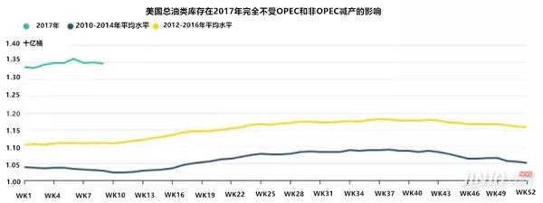 目前從多個(gè)第三方數(shù)據(jù)統(tǒng)計(jì)機(jī)構(gòu)的數(shù)據(jù)來(lái)看,全球主要經(jīng)濟(jì)體的總油類庫(kù)存在今年2月份有可能是實(shí)際上漲的,根據(jù)Euroil stock的庫(kù)存數(shù)據(jù)顯示,今年2月份歐洲雖然出現(xiàn)540萬(wàn)桶/日的原油庫(kù)存下降,但是這部分庫(kù)存下降被歐洲的成品油庫(kù)存增加完全彌補(bǔ)。與此同時(shí),根據(jù)JBC Energy公司的數(shù)據(jù),中國(guó)在今年2月份的原油庫(kù)存暴增了3000萬(wàn)桶。而美國(guó)的總油類庫(kù)存從2017年第一周就開(kāi)啟的高位庫(kù)存模式更是讓市場(chǎng)無(wú)語(yǔ),見(jiàn)下圖。