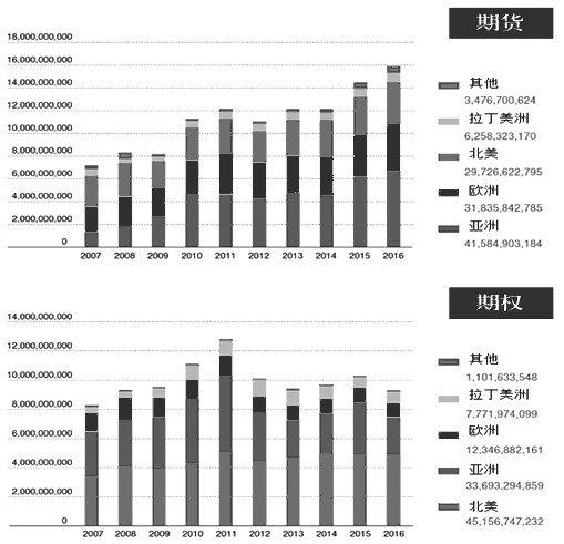 據(jù)美國(guó)期貨業(yè)協(xié)會(huì)(FIA)的最新統(tǒng)計(jì),2016年,全球期貨和期權(quán)成交量創(chuàng)下新高,但數(shù)字下卻隱藏著相當(dāng)大的變化,期貨成交量已是連續(xù)第5年增長(zhǎng),而期權(quán)成交量則降至2007年以來(lái)的最低水平。從地域分布看,北美、歐洲和拉丁美洲的成交量均有所增長(zhǎng),但亞太地區(qū)有所下降。從衍生品類別看,商品期貨、期權(quán)及利率衍生品成交量創(chuàng)2007年以來(lái)的新高,但股票衍生品成交量呈繼續(xù)下跌趨勢(shì)。