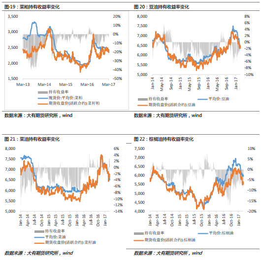 4、持有收益率:豆粕、菜粕持有收益率回升;豆油、棕油、菜油持有收益率回升。