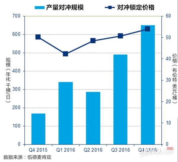 能源咨詢公司伍德麥肯茲(Wood Mackenzie)對33家頁巖油商披露的數(shù)據(jù)進行分析后發(fā)現(xiàn),隨著油市在去年年底開始恢復(fù),這些生產(chǎn)商紛紛增加對沖活動,以便將遠期交割的原油期貨價格鎖定在較高的水平。這意味著即使現(xiàn)在油價下跌,頁巖油商在整個2017年都能夠保證原油的供應(yīng)。