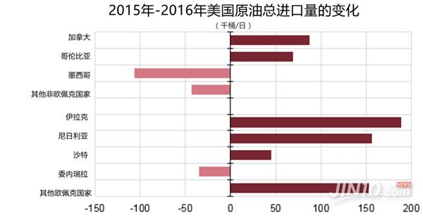 2016年美國(guó)原油進(jìn)口量之所以大增是因?yàn)槊绹?guó)從伊拉克和尼日利亞等國(guó)家的進(jìn)口量及進(jìn)口份額均有所增加。美國(guó)從伊拉克進(jìn)口的原油從2015年的22.9萬桶/日飆升至41.8萬桶/日,從尼日利亞進(jìn)口的原油從2015年的5.4萬桶/日飆升至21萬桶/日。