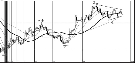 十債近期走勢看比較符合典型的推動浪結構,2浪不破1浪底,3浪不是最短(一般比1浪長),1浪、4浪不重合,且2浪簡單、4浪復雜(4浪多以收縮形態(tài)展開)。從十債2小時的圖看,3浪頂正好處于斐波拉契神奇周期89與144之間。4浪的結束點就是時點在比爾·威廉姆的MACD指標快慢線回0軸附近出現(xiàn)金叉。建議等待2小時圖MACD交金叉的時機。