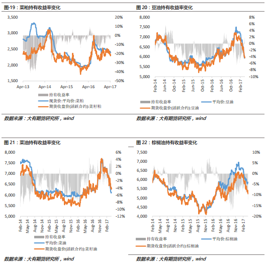 5、持有收益率:豆粕、菜粕持有收益率上漲;豆油、棕油、棕油持有收益率回升。