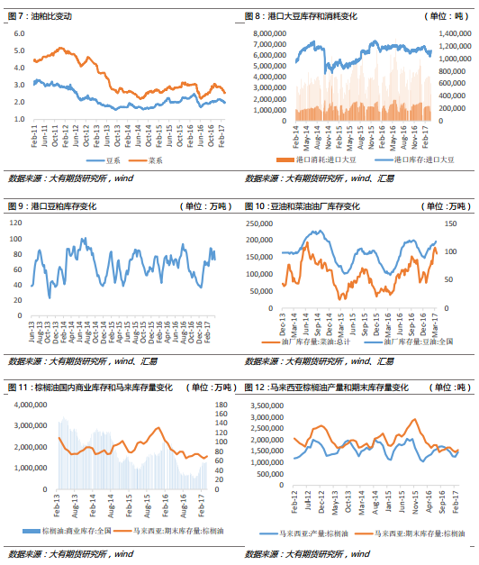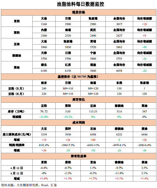 3、庫存和成交情況:豆粕庫存中幅減少,成交活躍;菜粕庫存減少,菜粕成交較少。豆油庫存持平,成交清淡;菜油成交清淡;棕櫚油庫存穩(wěn)定,成交清淡。