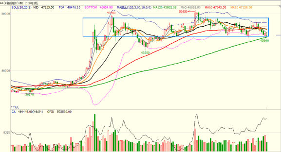 進(jìn)入4月份,清明節(jié)后,疊加一系列消息刺激,不斷出現(xiàn)跳空走勢(shì),進(jìn)入本周主力合約1706繼續(xù)回踩至短期箱體底部46000附近。