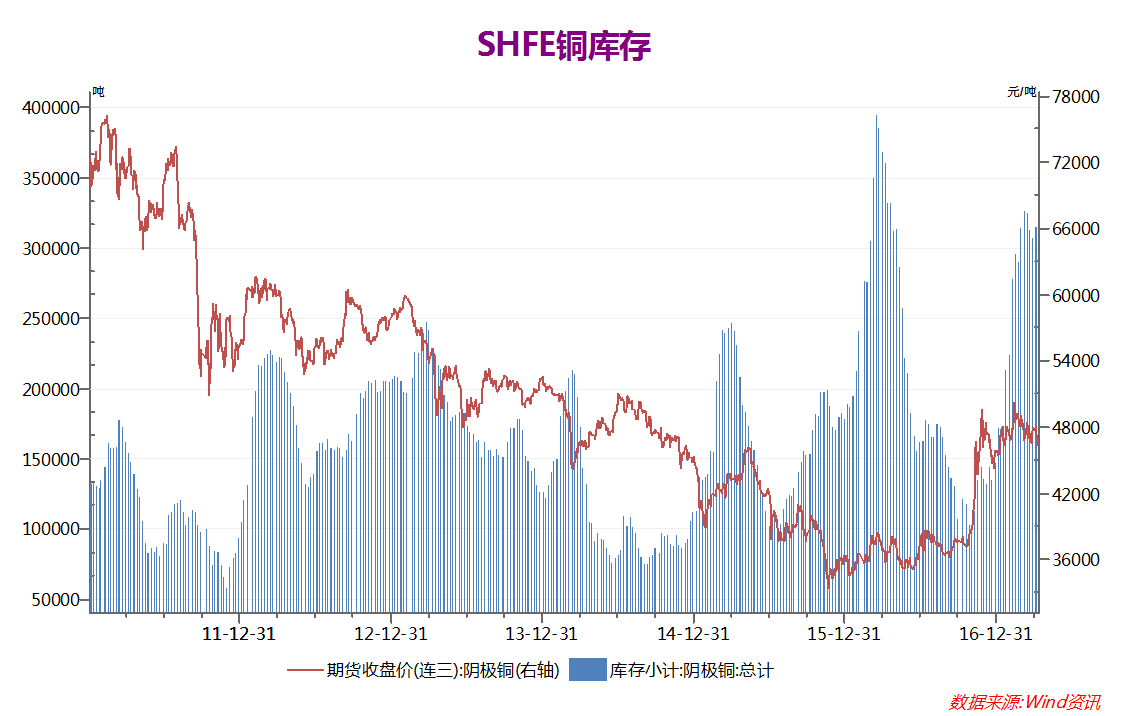 從去年暴漲的11月行情之后,滬銅一躍從3萬(wàn)時(shí)代,進(jìn)入了4萬(wàn)時(shí)代,從那以后銅價(jià)一路維持在44000-50000之間區(qū)間震蕩,這種橫盤(pán)的震蕩局面已經(jīng)維持了有5個(gè)月之余。進(jìn)入2017年之后,有效震蕩區(qū)間幅度更是收窄至46000-49000之間。在年后化工系、黑色系商品相繼淪陷的大宗商品盤(pán)面上,滬銅成了萬(wàn)綠叢中一點(diǎn)紅。