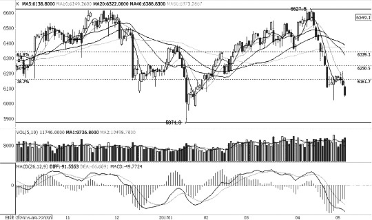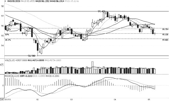 十債1706合約近日波動較窄,但上周再次下跌,形成近期新的低點,短線明顯處于空頭趨勢。目前價格運(yùn)行呈區(qū)間走勢,95.8點形成重要壓力。均線系統(tǒng)向下,MACD指標(biāo)運(yùn)行于0軸下方。操作上,建議密切關(guān)注95.8—96.1點壓力,維持逢高拋空思路。