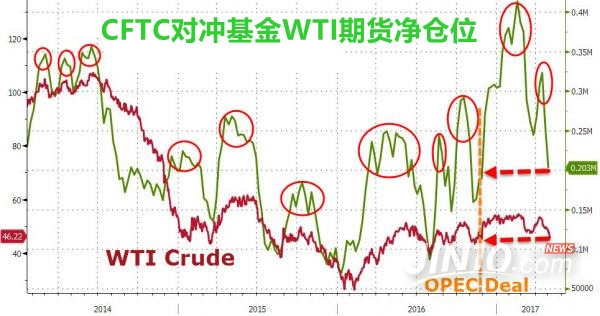 據(jù)CFTC報告顯示,截至5月9日當周,對沖基金和基金經(jīng)理原油凈多頭頭寸已減少17%至168814手, 是去年11月OPEC達成史上首個減產(chǎn)協(xié)議以來的最低水平。其中多單數(shù)量小幅上漲2.1%,空單數(shù)量激增37%?;ㄆ炷茉雌谪浄治鰩煱N乃?Tim Evans)認為,現(xiàn)在拋售越多,意味著之后買入的潛能越大。