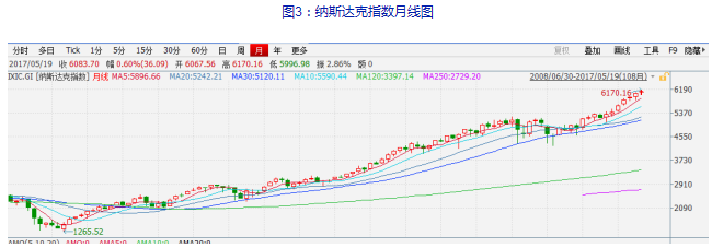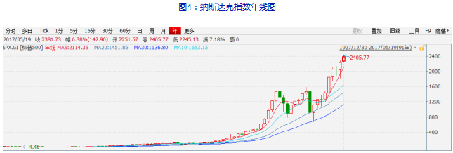 2. 現(xiàn)階段已經(jīng)是美股歷史上的第二大牛市,納斯達克指數(shù)由低點上升超過4倍,標準普爾則漲了3倍多。我們觀察到美股加速上漲的年份一般不超過5年,即使是2000年互聯(lián)網(wǎng)泡沫期間,在連續(xù)上漲五年后也出現(xiàn)了快速大幅的調(diào)整。截止今年5月,標普在6年中走出了5根大幅上漲的陽線,從時間節(jié)點來講,后續(xù)出現(xiàn)震蕩調(diào)整的可能性在加大,風(fēng)險也在加大。
