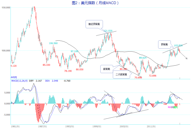 從技術(shù)上看,美元指數(shù)已出現(xiàn)月線形態(tài)MACD的頂背離。美元指數(shù)高點至103.82,MACD-DIFF高至2.7,與前高4.3形成明顯背離,預(yù)示長周期美元指數(shù)進入震蕩或者下跌格局。參照歷史數(shù)據(jù),2002年2月美元指數(shù)在頂背離后形成長期頂部,2005與2008年底美元指數(shù)在底背離后均有明顯的上漲。