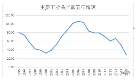 如果我們把幾種主要工業(yè)品的產(chǎn)量數(shù)據(jù)簡(jiǎn)單累加,再看其五年增速,就是上面這張圖。從中也能看出來,1995年之后的增速持續(xù)下滑和2007年之前的持續(xù)上漲形成鮮明的對(duì)比。