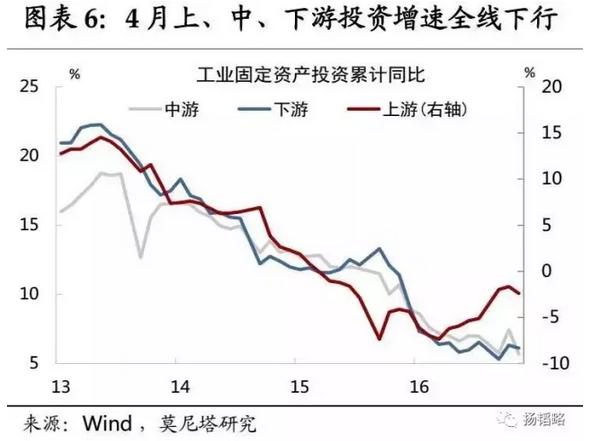 在本文即將完成時(shí),我看到香港離岸人民幣一周利率飆升到13.4%,顯示月底人民幣資金的進(jìn)展。今年3月以來,國(guó)內(nèi)金融去杠桿如火如荼,資金緊張局勢(shì)逐漸加劇,這已經(jīng)間接影響到投資和經(jīng)濟(jì)的運(yùn)行(如下莫尼塔的研究),股市也受到了間接的影響。