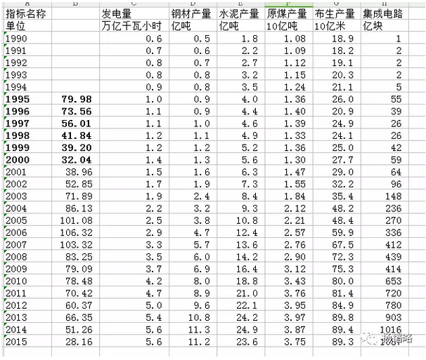 如圖,這是中國(guó)主要工業(yè)品過去25年的產(chǎn)量增長(zhǎng)情況。從中我們不難看出,1995-2000年,恰是一個(gè)產(chǎn)量增速非常慢的時(shí)期,比如,發(fā)電量、鋼材產(chǎn)量幾乎都在原地踏步。2002年開始,隨著投資規(guī)模的擴(kuò)大,各工業(yè)品產(chǎn)量急劇擴(kuò)大,中國(guó)經(jīng)濟(jì)也迎來了發(fā)展的黃金時(shí)期。在所謂的四萬億時(shí)期過后,各主要工業(yè)品產(chǎn)量繼續(xù)緩慢增長(zhǎng)。我們目前的經(jīng)濟(jì)發(fā)展,其實(shí)是在享受當(dāng)時(shí)大擴(kuò)張時(shí)的紅利。事實(shí)充分證明,那段產(chǎn)能大擴(kuò)張的時(shí)期,不僅必要,而且十分必要。