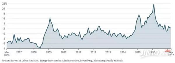 從上圖可以看出,美國油氣行業(yè)就業(yè)率同比變化在過去10年內(nèi)有過兩次大跌,一次是2008年金融危機,一次就是2014年下半年開始的油氣價格暴跌。需要特別指出的是:上圖的兩次就業(yè)率年度同比大跌都經(jīng)歷了非常明顯的深V反轉(zhuǎn)。美國油氣行業(yè)就業(yè)率年度同比在2015年3月進入負值,此后一直在負值區(qū)間運行,經(jīng)歷25個月后直到本月才首次出現(xiàn)正值。不過,雖然油氣行業(yè)就業(yè)率情況明顯向好,但是過去三個季度以來油氣板塊薪資占油氣公司營收的比例卻沒有提高。下圖是外媒估算的美國油氣行業(yè)薪資占油氣公司營收的比例。