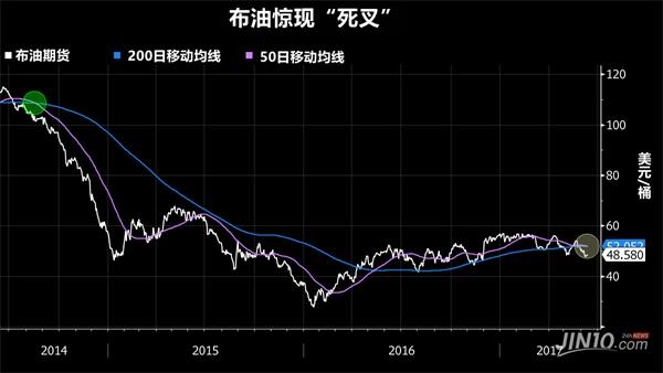 從技術面來看,布倫特原油期貨本周一形成死叉,50天移動均線下穿200日均線,發(fā)出看跌信號。死叉通常被認為標志著短期動能喪失,上一次出現(xiàn)是在2014年下半年,當時由于美國頁巖油生產(chǎn)激增造成原油供應過剩,油價崩盤。
