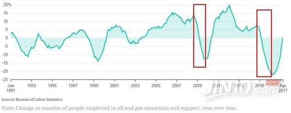 首先,北美油氣就業(yè)率25個月來首次轉(zhuǎn)正!下圖是美國勞工部的美國油氣行業(yè)就業(yè)率年度同比變化統(tǒng)計。