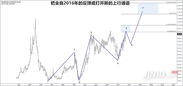 至于鈀金接下來的長期走勢(shì),從技術(shù)層面來看,如下圖所示,金融博客ElliottWave-Forecast指出,鈀金自2003年的低點(diǎn)開始震蕩走高,而最近1年多的漲勢(shì)(4-5)或?qū)⒋蜷_新的上升通道(6-7)。若按照目前的走勢(shì)發(fā)展下去,鈀金有可能先在今年余下時(shí)間向下修正,隨后在2018年年初再度迎來一波反彈,或?qū)⒅北?200美元/盎司一線。