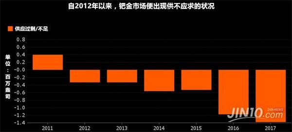 摘要 鈀金可謂大宗商品市場(chǎng)的一顆耀眼明星,擁有金屬之王美譽(yù)的黃金也顯得黯然失色。 今年至今,鈀金可謂大宗商品市場(chǎng)的一顆耀眼明星,在它的光芒遮蓋下,擁有金屬之王美譽(yù)的黃金也顯得黯然失色。隨著市場(chǎng)普遍認(rèn)為鈀金將迎來連續(xù)第6個(gè)供不應(yīng)求的年頭,鈀金年內(nèi)漲幅已達(dá)28%。更驚人的是,自從2016年以來,鈀金價(jià)格便開始震蕩上行,目前已經(jīng)累漲76%。