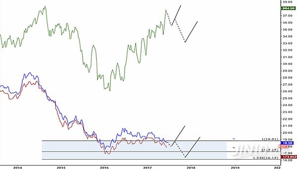 另外,從鈀金與大宗商品價(jià)格走勢(shì)的對(duì)比圖來看,鈀金接下來也有望迎來上升動(dòng)能。下圖紅線指代路透CRB商品指數(shù)(Thomson Reuters / Jefferies CRB Index),藍(lán)色代替智慧樹持續(xù)商品指數(shù)基金(WisdomTree Continuous Commodity Index Fund),這兩個(gè)指數(shù)均反映了大宗商品價(jià)格走勢(shì)??梢?,鈀金價(jià)格和這兩個(gè)指標(biāo)接下來均有望先向下修正,而后突破上行。