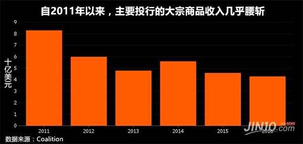 其實(shí),盡管表現(xiàn)不盡人意,高盛的大宗商品部門業(yè)績?nèi)匀辉谕缎兄邪蔚妙^籌。據(jù)倫敦?cái)?shù)據(jù)分析公司Coalition,去年主要投行的大宗商品收入下滑至11年新低;估計(jì)今年第一季度整個行業(yè)的大宗商品收入跌至僅8億美元,較去年同期下滑29%,不到2012年水平的三分之一。高盛能夠衛(wèi)冕大宗商品之王,部分原因也在于同行競爭的減少。