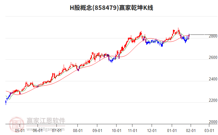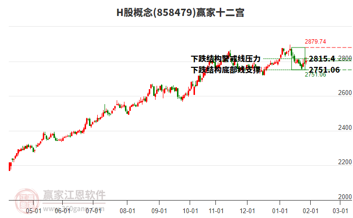 今天概念下穿前期2026年1月28日形成的下跌結(jié)構(gòu)警戒線2815.4點。依據(jù)贏家十二宮多空能量守恒規(guī)則,下跌結(jié)構(gòu)警戒線是多空能量平衡爭奪點,突破或跌破往往意味著平衡打破。若概念再次收復(fù)站穩(wěn)警戒線位置,多方能量有望再次主導(dǎo)進行上攻,將在頂部線2879.74點尋找多空能量平衡位。如概念不能收復(fù)該警戒線2815.4,則概念將會下探至底部線2751.06點再次尋找底部多空能量平衡位。
