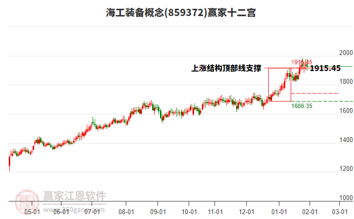 當(dāng)前處于12天前形成的贏家十二宮上漲結(jié)構(gòu)頂部線1915.45點(diǎn)上方,目前此位置由前方高點(diǎn)1月26日下跌至今日,跌幅3.54%。依據(jù)贏家十二宮結(jié)構(gòu)規(guī)則,若跌破頂部線,多方能量持續(xù)衰減,上漲動(dòng)能不足,空方能量占據(jù)主導(dǎo),向下警戒線1741.02點(diǎn)尋找多空能量平衡位。
