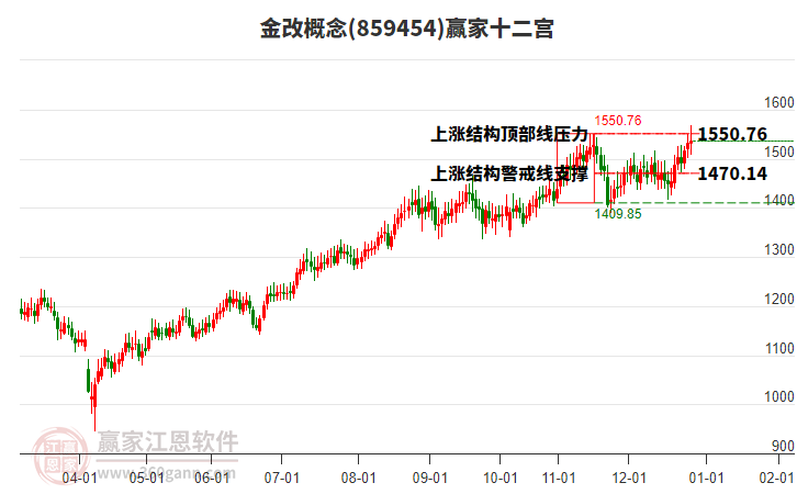 當(dāng)前處于52天前形成的贏家十二宮上漲結(jié)構(gòu)頂部線1550.76點(diǎn)上方,目前此位置由前方高點(diǎn)1月13日下跌至今日,跌幅5.89%。依據(jù)贏家十二宮結(jié)構(gòu)規(guī)則,若跌破頂部線,多方能量持續(xù)衰減,上漲動(dòng)能不足,空方能量占據(jù)主導(dǎo),向下警戒線1470.14點(diǎn)尋找多空能量平衡位。