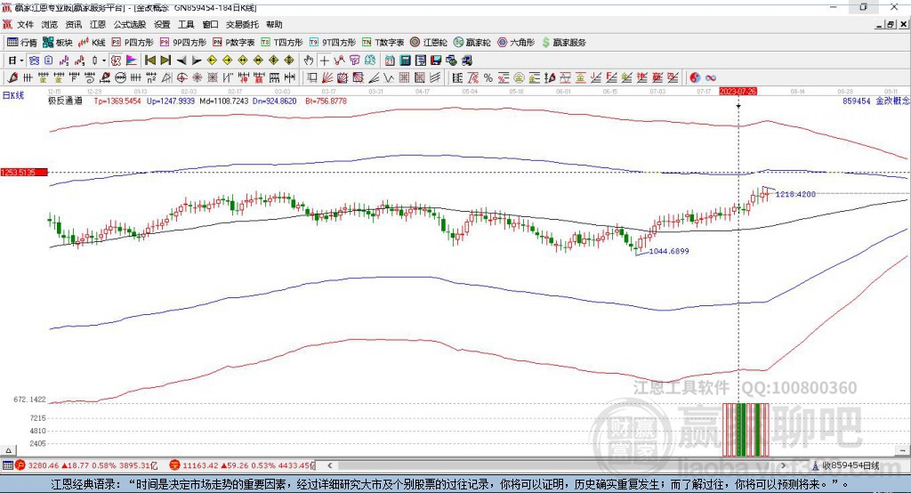 當前概念上穿強勢通道線1563.6489點,由強勢通道進入超強通道,依據(jù)贏家江恩極反通道規(guī)則,站穩(wěn)一線看高一線。若能有效站穩(wěn)強勢通道線,則有望持續(xù)上攻至強勢外軌線1924.6411點附近,若不能站穩(wěn)強勢通道線,由超強通道回歸強勢通道,注意短期回調。