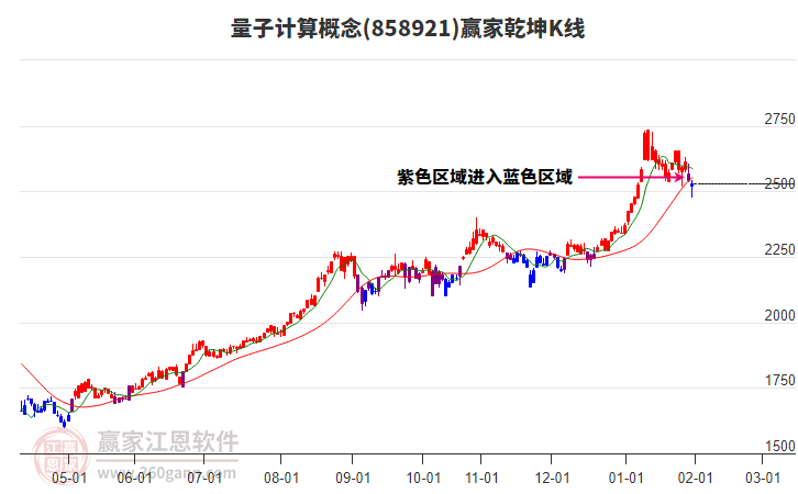 目前概念處于藍(lán)色區(qū)域(下跌趨勢),當(dāng)天概念以光腳上影中陰線收盤,K線收于出局線下方。近期波段低點(diǎn)為1月30日2477.52點(diǎn),若跌破前期低點(diǎn)2477.52,將形成短期下行趨勢,如短期概念快速進(jìn)入紅色區(qū)域,有望波段走強(qiáng)。