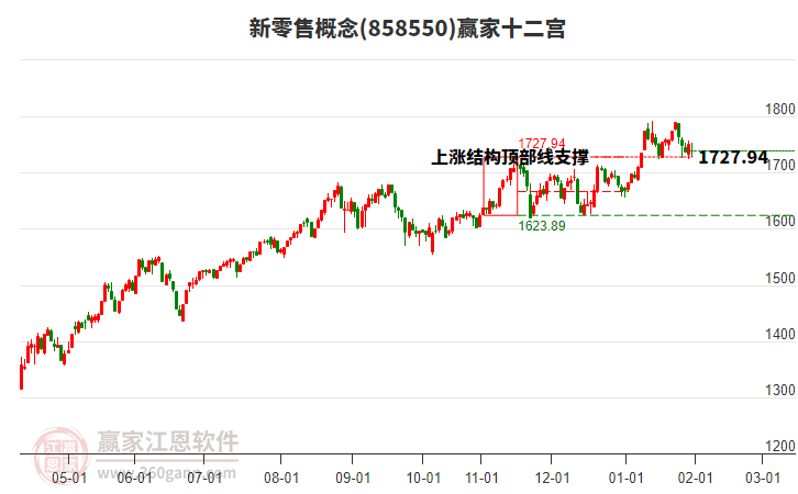 今日概念跌破上漲結(jié)構(gòu)頂部線1727.94點,概念自前方高點1月23日1789.72點持續(xù)下跌6日跌幅4.35%,依據(jù)贏家十二宮結(jié)構(gòu)規(guī)則,上漲結(jié)構(gòu)突破頂部線后再次跌落至頂部線,多空能量再次在頂部線尋找平衡。若確認(rèn)跌破頂部線,出現(xiàn)空方能量守恒狀態(tài),向下警戒線1666.25點尋找多空能量平衡位。