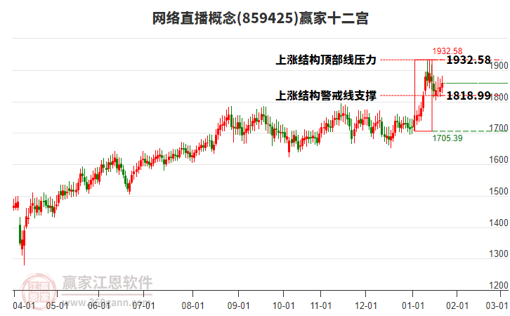 概念自近期高點1900.92跌至今日1824.61點,共下跌76.31點,跌幅4.18%,當前概念處于2026年1月15日形成的上漲結構頂部線與警戒線之間。依據(jù)贏家十二宮多空能量守恒規(guī)則,若多方能量再度聚集發(fā)力上攻,有望再度上攻關注結構頂部線1932.58點尋找平衡位;若跌破警戒線,空方繼續(xù)主導,則將進一步下探結構底部線1705.39點尋找平衡位。