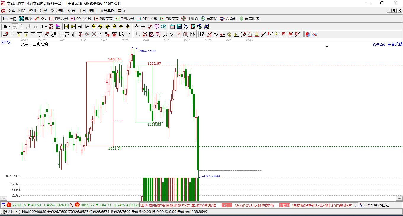 本周收1431.39點(diǎn),自近期低點(diǎn)1149.18上漲至今,受贏家江恩輪中輪三角形1418.51點(diǎn)支撐。依據(jù)贏家江恩輪中輪規(guī)則,市場中三分位、四分位是一切市場周期運(yùn)行的基礎(chǔ)。概念若繼續(xù)站穩(wěn)三角形1418.51關(guān)鍵位置,則有望漲至四方形關(guān)鍵位置1532.02點(diǎn)。若跌破三角形關(guān)鍵位置,向下看至四方形關(guān)鍵支撐位1305.0點(diǎn)。