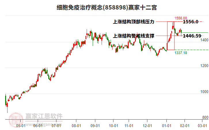 今天概念處在2026年1月15日形成的上漲結(jié)構(gòu)底部線與警戒線之間,今日概念大幅下跌2.26%,目前處于底部線上方。依據(jù)贏家十二宮多空能量守恒規(guī)則,上漲結(jié)構(gòu)底部線位置是多空能量轉(zhuǎn)換的一個關(guān)鍵位置。如底部線1337.18點支撐不破,由多方能量主導上攻,在警戒線1446.59點尋找多空能量平衡。如跌破底部線,空方動能占據(jù)主導,打開新的下跌空間。