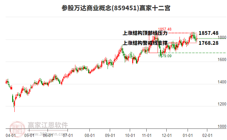 當天下穿52日前形成的上漲結構警戒線1768.28點,自前期高點1月26日,至今日概念下跌161.9點,短期處于多空能量動態(tài)平衡,依據贏家十二宮多空能量守恒規(guī)則,上漲結構警戒線是多空能量平衡爭奪點,突破或跌破往往意味著平衡打破。如確認跌破警戒線,多空能量平衡或將打破,同時空方將成為主導,向下方結構底部線1679.09點尋找新的能量平衡位。若快速收復警戒線,則多空能量可能再次展開反復爭奪。