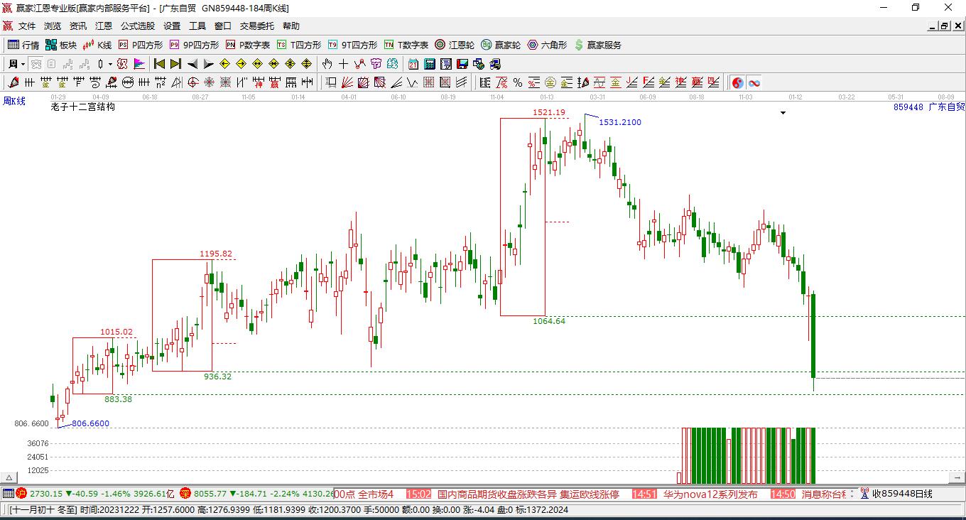 當(dāng)前處于29周前形成的贏家十二宮上漲結(jié)構(gòu)頂部線1481.44點(diǎn)上方,目前此位置由前方高點(diǎn)1月23日下跌至本周,跌幅5.04%。依據(jù)贏家十二宮結(jié)構(gòu)規(guī)則,若跌破頂部線,多方能量持續(xù)衰減,上漲動(dòng)能不足,空方能量占據(jù)主導(dǎo),向下警戒線1338.62點(diǎn)尋找多空能量平衡位。