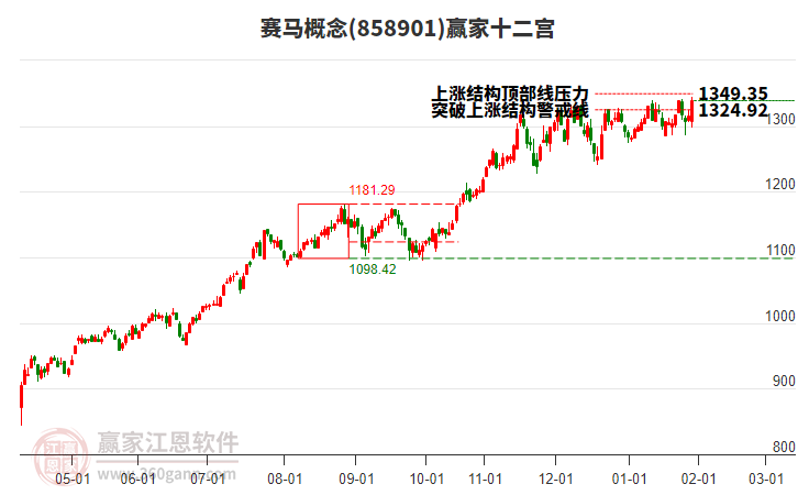 今日概念處于前期2017年5月9日形成的下跌結構頂部線1270.52點上方,近期概念在此位置呈現(xiàn)震蕩走勢,震蕩區(qū)間為1285.33-1345.63,今日收盤1297.5點,下跌1.61%。依據(jù)贏家十二宮多空能量守恒規(guī)則,下跌結構頂部線是多空能量轉(zhuǎn)換的關鍵位置,多方能量已連續(xù)釋放,空方能量不斷聚集。當前概念若能站穩(wěn)上漲結構頂部線1270.52,多方有望再一次發(fā)動上攻,若跌破上漲結構頂部線,則概念將會向下警戒線1220.56點位置附近尋找新的平衡位。