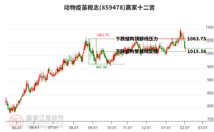 當(dāng)天概念下穿前期2025年9月5日形成的下跌結(jié)構(gòu)警戒線1015.38點(diǎn),本輪下跌自近期高點(diǎn)2月10日,持續(xù)3日下跌至今日1010.2,跌幅3.12%。依據(jù)贏家十二宮多空能量守恒規(guī)則,下跌結(jié)構(gòu)警戒線是多空能量平衡爭(zhēng)奪點(diǎn),突破或跌破往往意味著平衡打破。若概念再次收復(fù)站穩(wěn)警戒線位置,多方能量有望再次主導(dǎo)進(jìn)行上攻,將在頂部線1063.75點(diǎn)尋找多空能量平衡位。如概念不能收復(fù)該警戒線1015.38,則概念將會(huì)下探至底部線967.0點(diǎn)再次尋找底部多空能量平衡位。