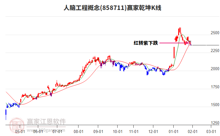 今日概念以下影小陰線收盤,當(dāng)前跌破關(guān)注線,由紫色區(qū)域進(jìn)入藍(lán)色區(qū)域(下跌趨勢),依據(jù)贏家江恩乾坤K線多空模型,此信號(hào)往往預(yù)示著波段開始走弱,后續(xù)如保持在空頭出局線下方運(yùn)行以看空為主,一旦突破空頭出局線預(yù)示短線有望走強(qiáng)迎來反彈。