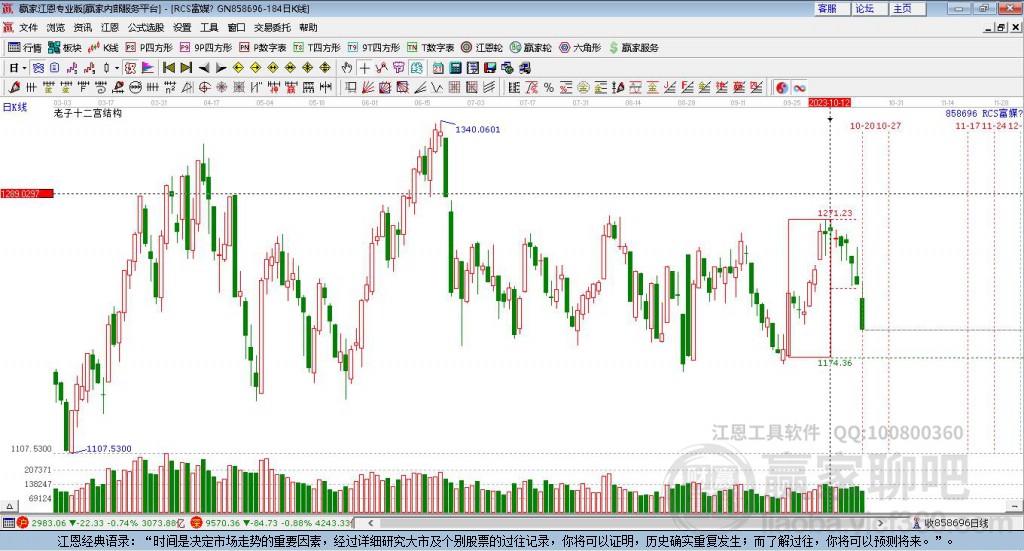 10月23日概念收1159.02點,大幅下跌2.91%,跌破贏家江恩輪中輪四方形重要支撐位置1192.93點。依據(jù)贏家江恩輪中輪規(guī)則,市場中圓形、三角形、四方形是一切市場周期運行的基礎。概念若不能快速收復四方形關鍵位置,則順時針回看三角形關鍵位置1143.89點,若能再次站穩(wěn)四方形關鍵位置,則逆時針上看三角形關鍵位置1209.28點。