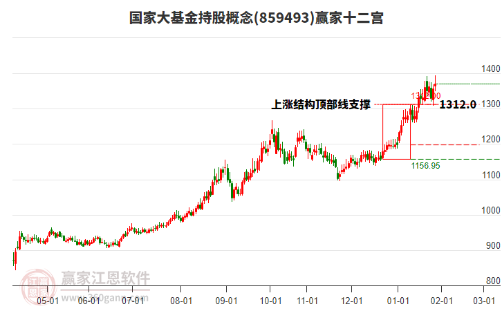 當(dāng)天概念跌破上漲結(jié)構(gòu)頂部線1312.0點(diǎn),概念自前方高點(diǎn)1月28日1393.99點(diǎn)持續(xù)下跌3日跌幅8.13%,依據(jù)贏家十二宮結(jié)構(gòu)規(guī)則,上漲結(jié)構(gòu)突破頂部線后再次跌落至頂部線,多空能量再次在頂部線尋找平衡。若確認(rèn)跌破頂部線,出現(xiàn)空方能量守恒狀態(tài),向下警戒線1197.64點(diǎn)尋找多空能量平衡位。