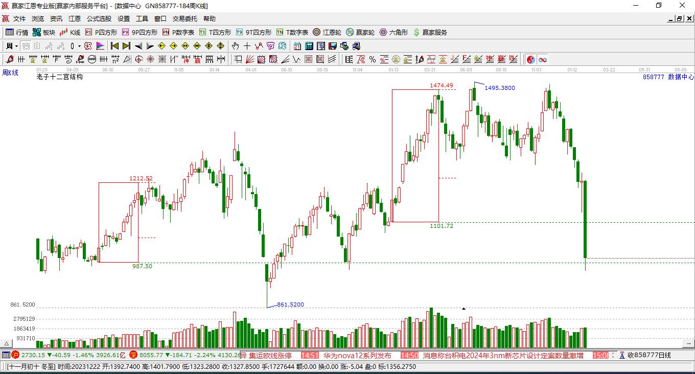 當前處于19周前形成的贏家十二宮上漲結(jié)構(gòu)頂部線2238.2點上方,目前此位置由前方低點4月11日上攻至本周,漲幅達78.3%。依據(jù)贏家十二宮結(jié)構(gòu)規(guī)則,若跌破頂部線,多方能量持續(xù)衰減,上漲動能不足,空方能量占據(jù)主導,向下警戒線1986.92點尋找多空能量平衡位。