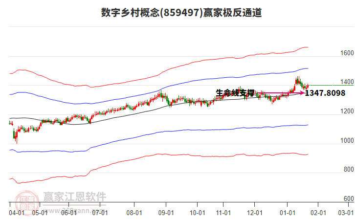 概念于1月13日高點1461.7,展開一波下跌,今日跌破生命線1353.8982點,進入弱勢通道, 依據(jù)極反通道規(guī)則,失守一線,看低一線,短期走弱,若此處不能收復生命線,則繼續(xù)下探至弱勢通道線附近尋找支撐。