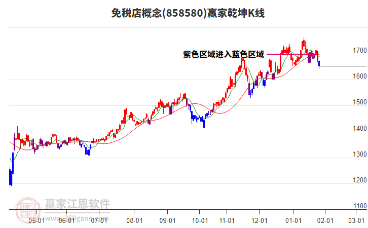 概念于1月23日高點1715.26,展開一波下跌,今日跌破生命線1660.4147點,進入弱勢通道, 依據(jù)極反通道規(guī)則,失守一線,看低一線,短期走弱,若此處不能收復(fù)生命線,則繼續(xù)下探至弱勢通道線附近尋找支撐。