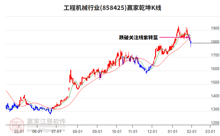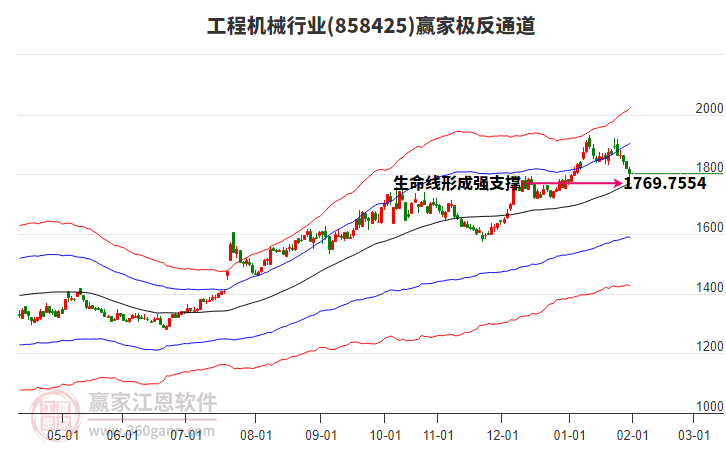 行業(yè)于1月13日高點1932.08,展開一波下跌,今日跌破生命線1773.7287點,進入弱勢通道, 依據(jù)極反通道規(guī)則,失守一線,看低一線,短期走弱,若此處不能收復生命線,則繼續(xù)下探至弱勢通道線附近尋找支撐。