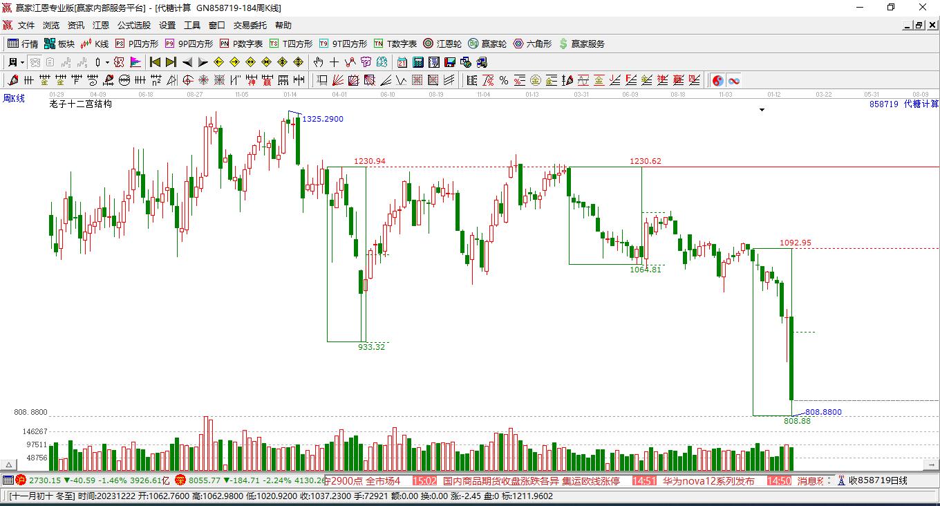 當(dāng)前處于20周前形成的贏家十二宮上漲結(jié)構(gòu)頂部線1391.54點(diǎn)上方,目前此位置由前方低點(diǎn)12月19日上攻至本周,漲幅達(dá)16.42%。依據(jù)贏家十二宮結(jié)構(gòu)規(guī)則,若跌破頂部線,多方能量持續(xù)衰減,上漲動(dòng)能不足,空方能量占據(jù)主導(dǎo),向下警戒線1328.1點(diǎn)尋找多空能量平衡位。