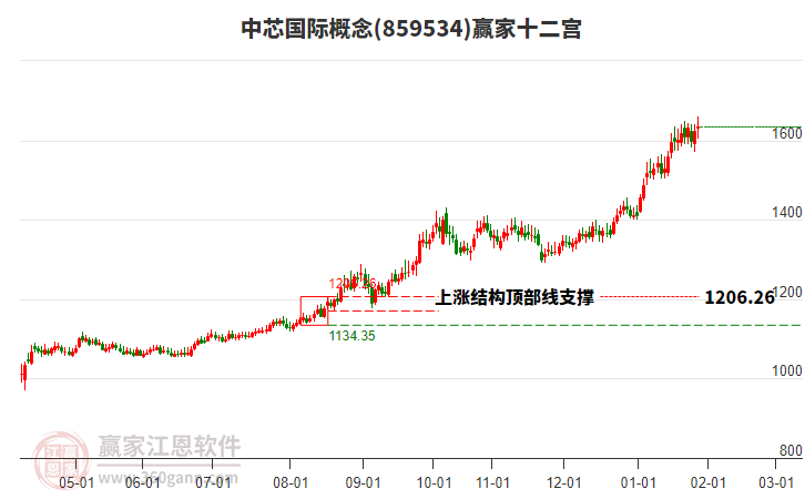 當前處于112天前形成的贏家十二宮上漲結(jié)構(gòu)頂部線1206.26點上方,目前此位置由前方高點1月28日下跌至今日,跌幅7.75%。依據(jù)贏家十二宮結(jié)構(gòu)規(guī)則,若跌破頂部線,多方能量持續(xù)衰減,上漲動能不足,空方能量占據(jù)主導,向下警戒線1170.3點尋找多空能量平衡位。