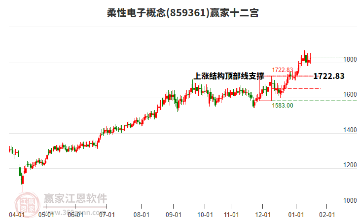 當前處于36天前形成的贏家十二宮上漲結構頂部線1722.83點上方,目前此位置由前方高點1月26日下跌至今日,跌幅5.11%。依據(jù)贏家十二宮結構規(guī)則,若跌破頂部線,多方能量持續(xù)衰減,上漲動能不足,空方能量占據(jù)主導,向下警戒線1652.91點尋找多空能量平衡位。